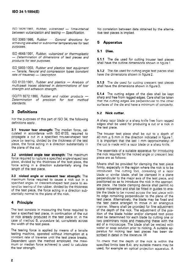 ISO 34-1:1994 is a standard published by the International Organization for Standardization (ISO). Its full title is "Rubber, vulcanized or thermoplastic — Determination of tear strength — Part 1: Trouser, angle and crescent test pieces". This standard covers: Specifies three test methods for the determination of the tear strength of vulcanized rubber: method A, using a trouser test piece; method B, using an angle test piece, with or without a nick of specified depth; method C, using a crescent test piece with a nick. The value of tear strength obtained depends on the shape of the test piece, speed of stretching and temperature of test. It may also be susceptible to grain effects in vulcanized rubber.