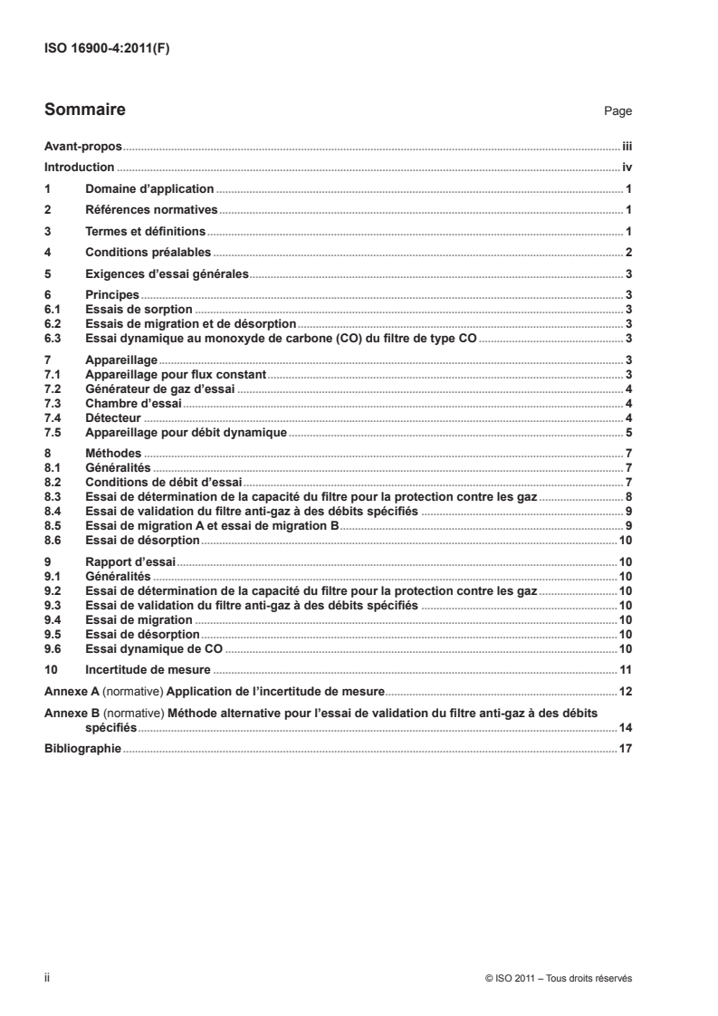 ISO 16900-4:2011 defines laboratory test methods and test equipment for determining the gas filter capacity of separate, integral and combined filters used in respiratory protective devices (RPD). The standard covers sorption (gas capacity) testing, gas filter validation at specified flow rates, migration and desorption assessments, and carbon monoxide (CO) dynamic testing. It is a supplement to RPD performance standards and specifies how to measure breakthrough times, retained mass/volume of test agents and effluent CO over time.