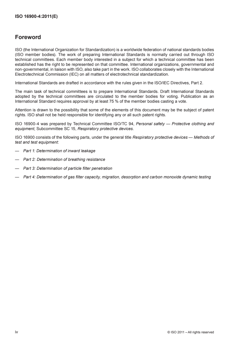 ISO 16900-4:2011 - Respiratory protective devices — Methods of test and test equipment — Part 4: Determination of gas filter capacity and migration, desorption and carbon monoxide dynamic testing Released:8/18/2011