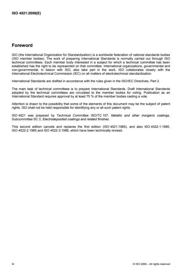 ISO 4521:2008 is a standard published by the International Organization for Standardization (ISO). Its full title is "Metallic and other inorganic coatings - Electrodeposited silver and silver alloy coatings for engineering purposes - Specification and test methods". This standard covers: ISO 4521:2008 specifies requirements for electroplated silver and silver alloy coatings for electrical, electronic and other engineering applications, including test methods. Engineering applications are defined as those in which the coating essentially serves a non-decorative purpose. Although ISO 4521:2008 does not specify the condition, finish or surface roughness of the basis material prior to electroplating, the appearance and serviceability of electroplated silver and silver alloy coatings depends on the condition of the basis material. It is essential that the purchaser specifies the surface finish and roughness of the basis material in order to conform to the product requirements. ISO 4521:2008 does not apply to coatings on screw threads or to coatings on sheet, strip or wire in the non-fabricated form.
