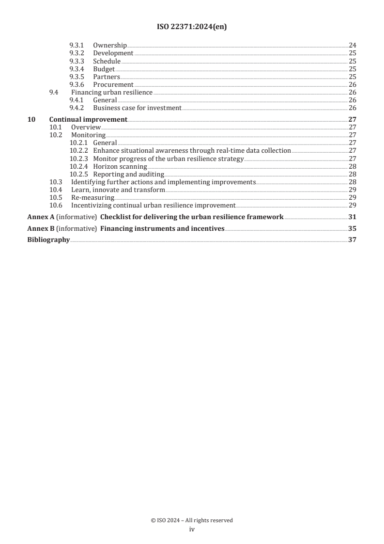 ISO 22371:2024 is a standard published by the International Organization for Standardization (ISO). Its full title is "Security and resilience - Community resilience - Principles, framework and guidelines on urban resilience". This standard covers: This document provides principles, framework and guidelines on how to enhance urban resilience to protect communities, people and organizations and improve residents' quality of life. It describes: a) how to build capacity to better manage change and disruptive events, minimizing the impacts on the residents, including the most disadvantaged and vulnerable persons; b) the benefits of urban resilience; c) how to organize, assess, plan, implement and continually improve urban resilience. This document is applicable to all urban contexts, governance structures and stakeholders for all identified levels of risk. It is intended to be used by all organizations that have accountability for resilience of services in urban communities.