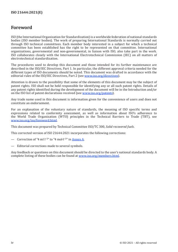 ISO 21644:2021 is a standard published by the International Organization for Standardization (ISO). Its full title is "Solid recovered fuels — Methods for the determination of biomass content". This standard covers: This document specifies three methods for the determination of the biomass content in solid recovered fuels: the 14C content method, the selective dissolution and the manual sorting methods.