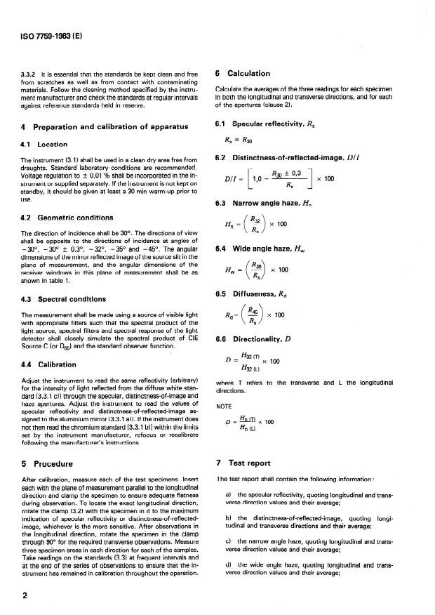 ISO 7759:1983 is a standard published by the International Organization for Standardization (ISO). Its full title is "Anodizing of aluminium and its alloys — Measurement of reflectivity characteristics of aluminium surfaces using abridged goniophotometer or goniophotometer". This standard covers: Specifies a method for the measurement of the reflectivity characteristics responsible for the appearance of high-gloss metal surfaces. The method is not suitable for diffuse-finish metal surfaces, nor does it measure colour, which is another appearance attribute. Precision of goniophotometers is included in an annex.