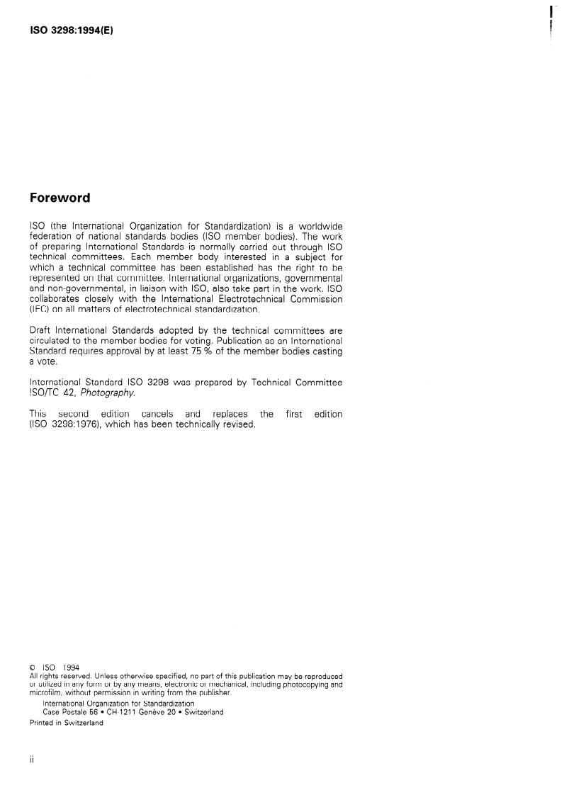 ISO 3298:1994 is a standard published by the International Organization for Standardization (ISO). Its full title is "Photography - Processing chemicals - Specifications for glacial acetic acid". This standard covers: Establishes criteria for the purity and describes the test methods for non-volatile matter, heavy metals content, iron content, appearance of solution.