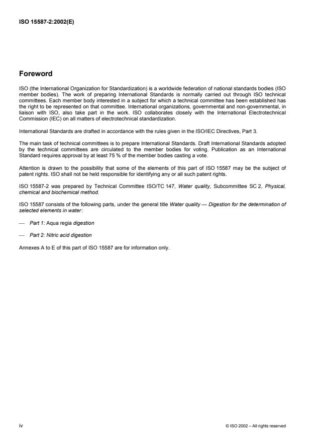 ISO 15587-2:2002 is a standard published by the International Organization for Standardization (ISO). Its full title is "Water quality — Digestion for the determination of selected elements in water — Part 2: Nitric acid digestion". This standard covers: This part of ISO 15587 specifies a method for extracting trace elements from a water sample using nitric acid as a digestion agent. The method is applicable to all types of waters with a suspended solids concentration of less than 20 g/l and a total organic carbon (TOC) concentration expressed as carbon of less than 5 g/l. The nitric acid digestion method is empirical and it might not necessarily release elements completely. However, for most environmental applications the result is fit for purpose. Nitric acid digestion is suitable for the release of: Al*, As, B, Ba*, Be*, Ca, Cd, Co, Cr*, Cu, Fe*, Hg, K, Mg*, Mn, Mo, Na, Ni, P, Pb, Se, Sr, Tl, V*, Zn (asterisk indicates a possible lower recovery compared to the aqua regia digestion method specified in ISO 15587-1). It is suitable for the release of Ag only if the sample is stabilized immediately after digestion. Nitric acid digestion is not suitable for Sb, Sn and for the digestion of refractory compounds such as SiO 2, TiO2 and Al2O3. The method is generic and may be implemented using a wide variety of equipment provided the digestion composition is unchanged, the digestion temperature is known, and the digestion duration is in accordance with this temperature.