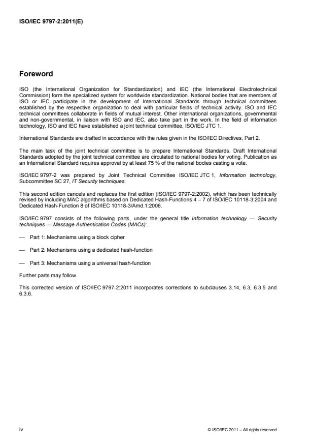Message Authentication Code (MAC) algorithms are data integrity mechanisms that compute a short string (the Message Authentication Code or MAC) as a complex function of every bit of the data and of a secret key. Their main security property is unforgeability: someone who does not know the secret key should not be able to predict the MAC on any new data string. MAC algorithms can be used to provide data integrity. Their purpose is the detection of any unauthorized modification of the data such as deletion, insertion, or transportation of items within data. This includes both malicious and accidental modifications. MAC algorithms can also provide data origin authentication. This means that they can provide assurance that a message has been originated by an entity in possession of a specific secret key. ISO/IEC 9797-2:2011 specifies three MAC algorithms that are based on a dedicated hash-function (selected from ISO/IEC 10118-3). ISO/IEC 9797-2:2011 specifies three MAC algorithms that use a secret key and a hash-function (or its round-function) with an n-bit result to calculate an m-bit MAC. The strength of the data integrity mechanism and message authentication mechanism is dependent on the length (in bits) k and secrecy of the key, on the length (in bits) n of the hash-function and its strength, on the length (in bits) m of the MAC, and on the specific mechanism. The first mechanism specified in ISO/IEC 9797-2:2011 is commonly known as MDx-MAC. It calls the complete hash-function once, but it makes a small modification to the round-function by adding a key to the additive constants in the round-function. The second mechanism specified in ISO/IEC 9797-2:2011 is commonly known as HMAC. It calls the complete hash-function twice. The third mechanism specified in ISO/IEC 9797-2:2011 is a variant of MDx-MAC that takes as input only short strings (at most 256 bits). It offers a higher performance for applications that work with short input strings only.