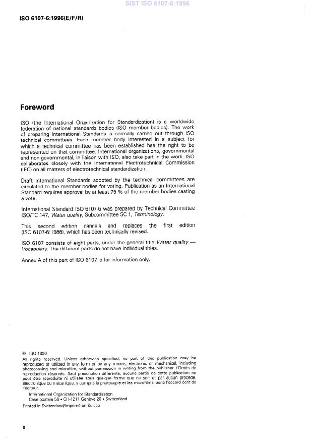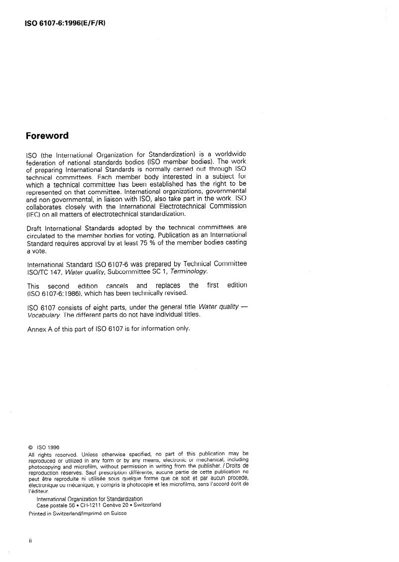 ISO 6107-6:1996 is a standard published by the International Organization for Standardization (ISO). Its full title is "Water quality — Vocabulary". This standard covers: Defines a sixth list of terms used in certain fields of water quality characterization. Replaces the first edition.