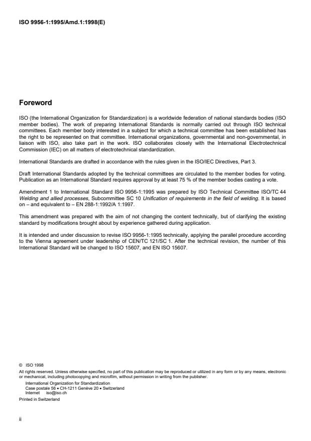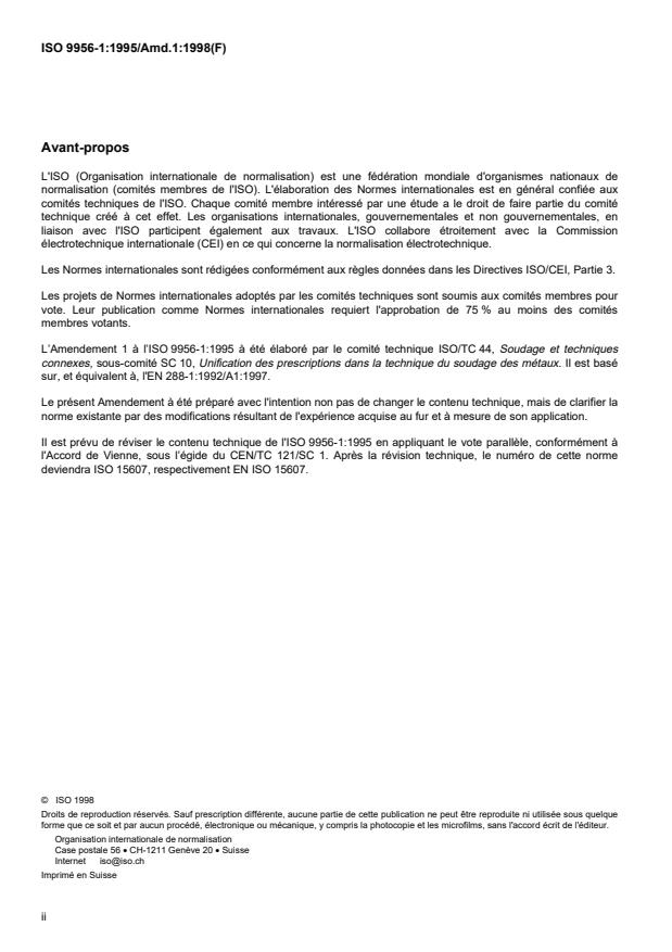 L’Amendement 1 à l’ISO 9956-1:1995 à été élaboré par le comité technique ISO/TC 44, Soudage et techniques