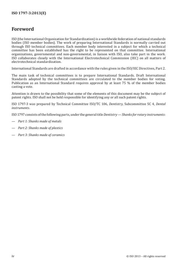 ISO 1797-3:2013 is a standard published by the International Organization for Standardization (ISO). Its full title is "Dentistry — Shanks for rotary instruments — Part 3: Shanks made of ceramics". This standard covers: ISO 1797-3:2013 specifies ceramic shanks of rotary instruments used in dentistry and gives measurement methods for the verification of the dimensions.