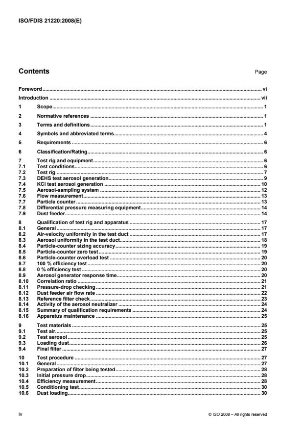 ISO/FDIS 21220 is a draft published by the International Organization for Standardization (ISO). Its full title is "Particulate air filters for general ventilation — Determination of the filtration performance". This standard covers: ISO 21220:2008 refers to particulate air filters for general ventilation. It describes testing methods and the test rig for measuring filter performance. The test rig is designed for an air flow rate between 0,25 m3/s (900 m3/h, 530 ft3/min) and 1,5 m3/s (5 400 m3/h, 3 178 ft3/min). ISO 21220:2008 applies to air filters having an initial efficiency of less than 99 % with respect to 0,4 µm particles. Filters in the higher end and above 99 % initial efficiency are tested and classified according to other standards. Two test methods are combined in ISO 21220:2008: a “fine method” for air filters in the higher efficiency range and a “coarse method” for lower efficiency filters. In either case, a flat sheet media sample or media pack sample from an identical filter shall be conditioned (discharged) to provide information about the intensity of the electrostatic removal mechanism. After determination of its initial efficiency, the untreated filter is loaded with synthetic dust in one step until its final test-pressure drop is reached. Information on the loaded performance of the filter is then obtained. The performance results obtained in accordance with ISO 21220:2008 cannot, by themselves, be quantitatively applied to predict performance in service with regard to efficiency and lifetime. It is necessary to take into account other factors influencing performance.