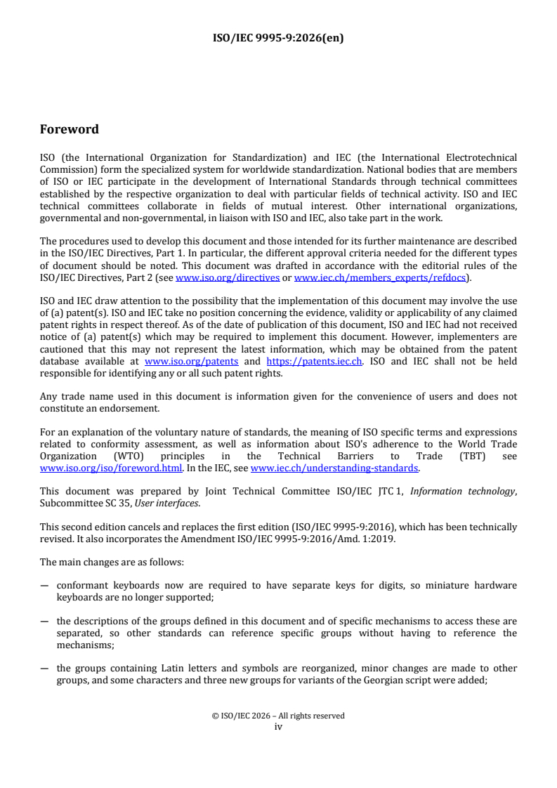 ISO/IEC 9995-9:2026 is a standard published by the International Organization for Standardization (ISO). Its full title is "Information technology — Keyboard layouts for text and office systems — Part 9: Groups and mechanisms for multilingual and multiscript input". This standard covers: Within the general scope described in ISO/IEC 9995-1, this document defines mappings of different sets of graphic characters onto the uppercase and lowercase forms of the 26 basic Latin characters (A–Z and a–z) and the digits 0–9, each of these mappings constituting a “group” as defined in ISO/IEC 9995-2. A detailed synopsis is contained in the informative Annex C. This document is primarily intended for word-processing and text-processing applications, to be used with keyboards which have at least 26 dedicated keys to enter letters and 10 additional keys to enter decimal digits.