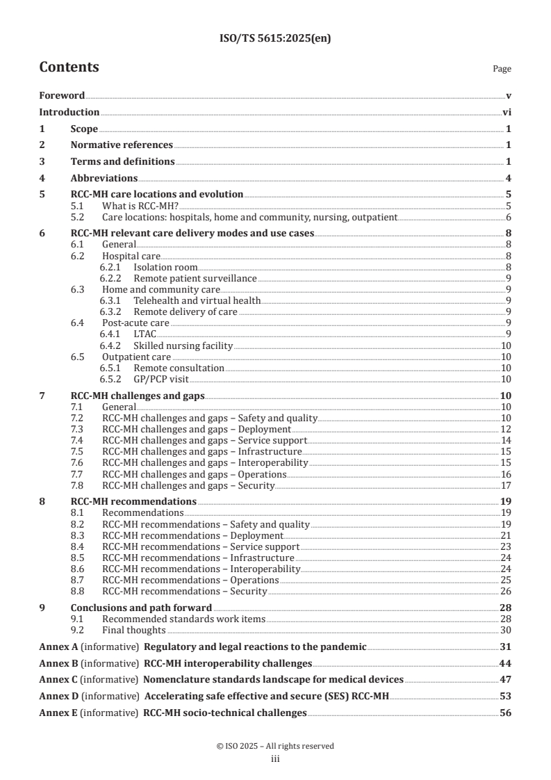 ISO/TS 5615:2025 is a technical specification published by the International Organization for Standardization (ISO). Its full title is "Health informatics - Accelerating safe, effective and secure remote connected care and mobile health through standards-based interoperability solutions addressing gaps revealed by pandemics". This standard covers: This document reviews the structural changes that have been precipitated by the COVID-19 pandemic in Remote Connected Care and Mobile Health (RCC-MH). The impact of the COVID-19 pandemic on care settings such as home and community care, acute care and outpatient care are reviewed discussing how well these healthcare environments were prepared to address the encountered connectivity challenges from a standards point of view. The current standards landscape is reviewed and gaps are identified leading to recommendations for future standards work.