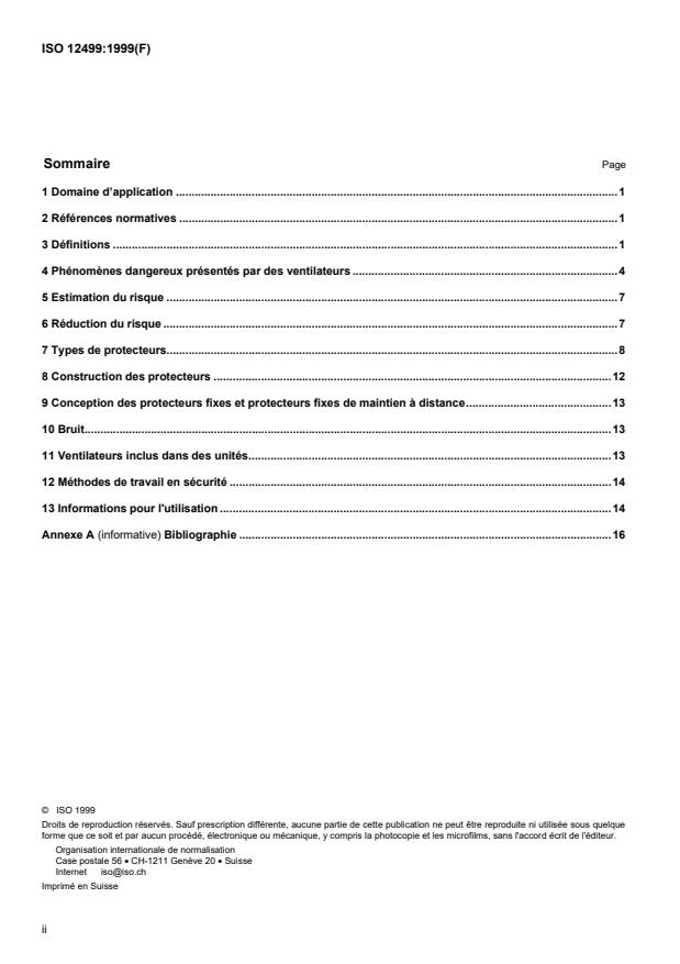 ISO 12499:1999 is a standard published by the International Organization for Standardization (ISO). Its full title is "Industrial fans - Mechanical safety of fans - Guarding". This standard covers: La présente Norme internationale traite des aspects de sécurité de la protection mécanique des ventilateurs industriels.Les circonstances dans lesquelles des mesures de sécurité doivent être prises sont décrites et des informations sur la façon dont les risques peuvent être réduits, ou éliminés sont données ainsi que des indications sur les méthodes de travail en sécurité et une information pour l'utilisation.