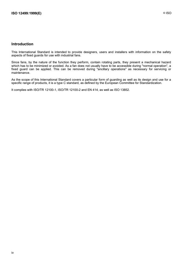 ISO 12499:1999 - Industrial fans: Mechanical safety of fans - Guarding defines requirements and guidance for the mechanical guarding of industrial fans. It addresses hazards, risk assessment, reduction of risk, types of safeguards (especially fixed and fixed-distance guards), guard construction, removal/maintenance rules, noise and windmilling effects, safe working practices and information for use. The standard is intended for designers, manufacturers, installers and users of industrial fans and complements other machine-safety standards.