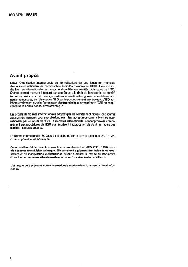 ISO 3170:1988 is a standard published by the International Organization for Standardization (ISO). Its full title is "Petroleum liquids — Manual sampling". This standard covers: Specifies procedures for liquid hydrocarbons, tank residues and deposite from fixed tanks, rail cars, road vehicles, ships and barges, drums and cans, or from liquids being pumped in pipelines. Does not apply for special products, such as aviation fuels, electrical insulating oils, liquefied petroleum gases, liquefied natural gases. bitumen and chemical products, nor to unstabilized crude oils having a Reid vapour pressure above 180 kPa.