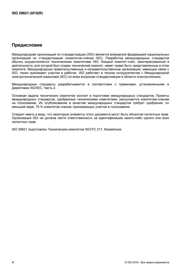 L'ISO 29621:2010 a pour objectif d'aider les fabricants de cosmétiques et les instances réglementaires à déterminer, en fonction d'une «appréciation du risque», les produits finis qui présentent un faible risque de contamination microbienne au cours de la fabrication et/ou de l'utilisation, et, par conséquent, ne nécessitent pas la mise en œuvre des Normes internationales de microbiologie relatives aux cosmétiques.