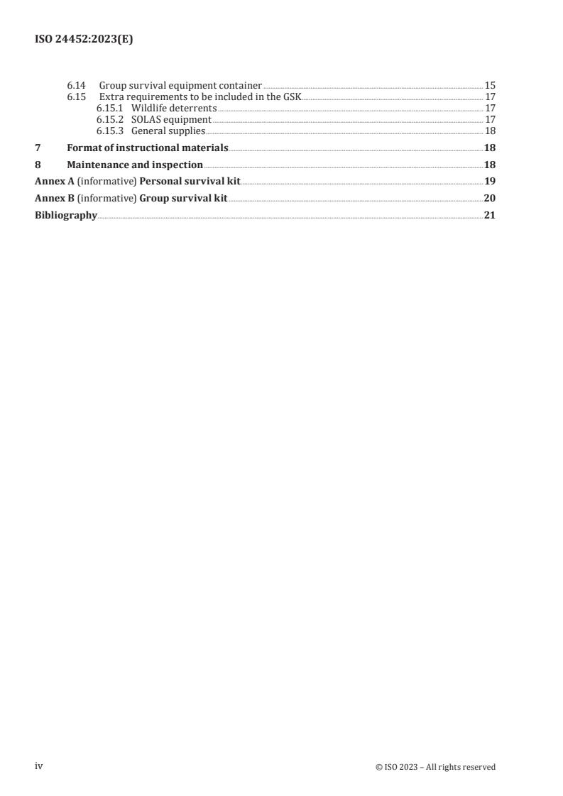 ISO 24452:2023 is a standard published by the International Organization for Standardization (ISO). Its full title is "Ships and marine technology - Personal and group survival kit for use in polar water". This standard covers: This document specifies design, performance and use of items of survival equipment, as part of a personal survival kit (PSK) and a group survival kit (GSK) that are required by the 1974 International Convention of the Safety of Life at Sea (1974 SOLAS) as amended, in particular chapter XIV (MSC. 386(94)) and the International Code for Ships Operating in Polar Waters (Polar Code - MSC.385 (94) and MEPC.264(68), as amended).