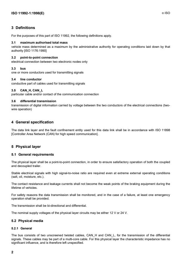 ISO 11992-1:1998 is a standard published by the International Organization for Standardization (ISO). Its full title is "Road vehicles — Electrical connections between towing and towed vehicles — Interchange of digital information — Part 1: Physical layer and data link layer". This standard covers: Road vehicles — Electrical connections between towing and towed vehicles — Interchange of digital information — Part 1: Physical layer and data link layer