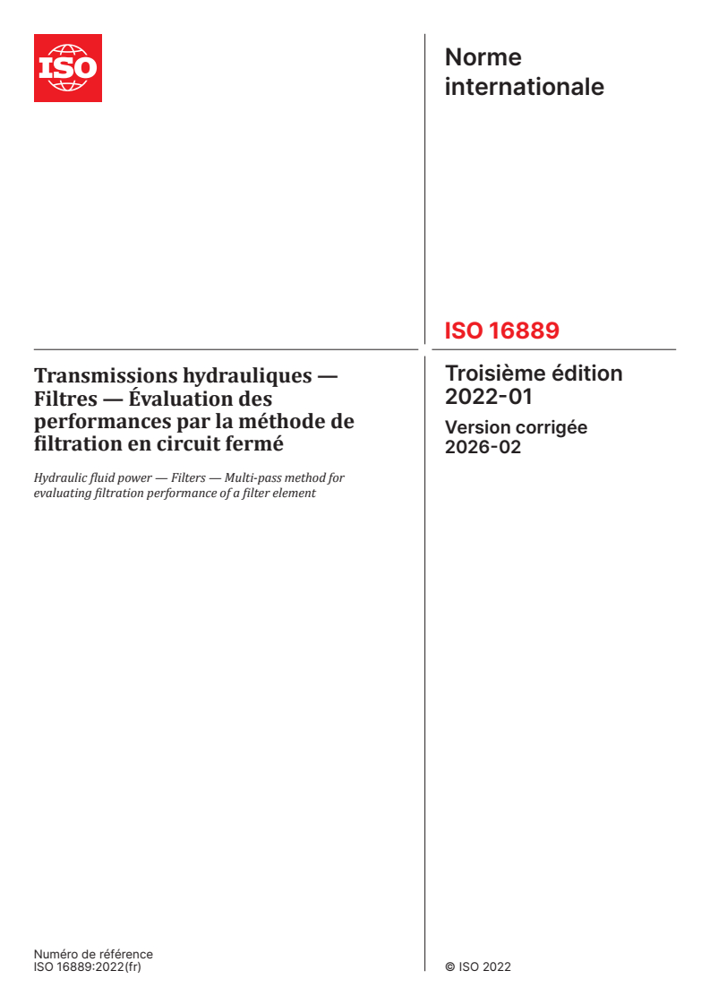 ISO 16889:2022 - Transmissions hydrauliques — Filtres — Évaluation des performances par la méthode de filtration en circuit fermé Released:2/9/2026