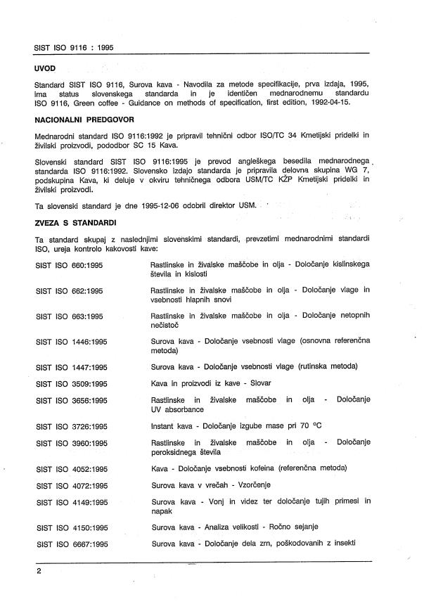 ISO 9116:1992 is a standard published by the International Organization for Standardization (ISO). Its full title is "Green coffee — Guidance on methods of specification". This standard covers: Gives guidance on methods to be used to describe green coffee for sale and purchase and is based on the terms of contract used in the international coffee trade. It also recommends procedures for sampling, packing, marking, storage and shipping of green coffee. It applies to green coffee as defined in ISO 3509.