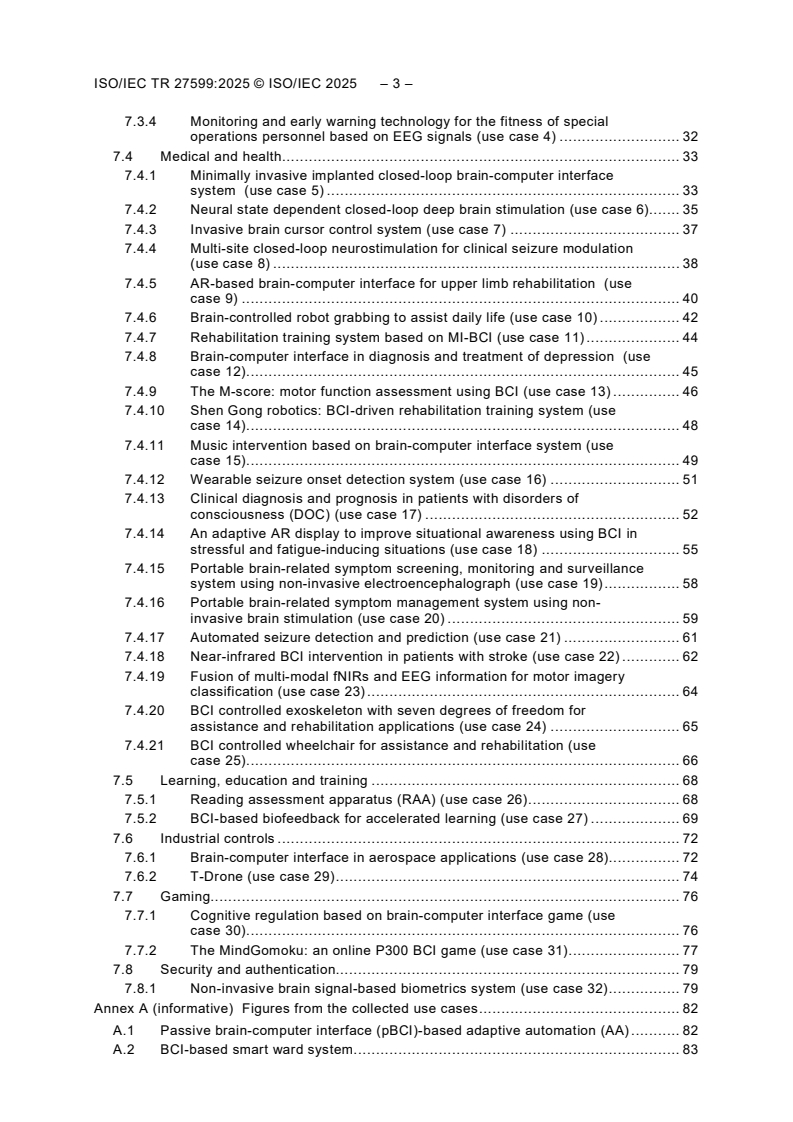 Keywords: ISO/IEC TR 27599:2025, brain‑computer interface, BCI use cases, EEG, signal processing, standardization, BCI applications, medical BCI, smart environment, industrial BCI.