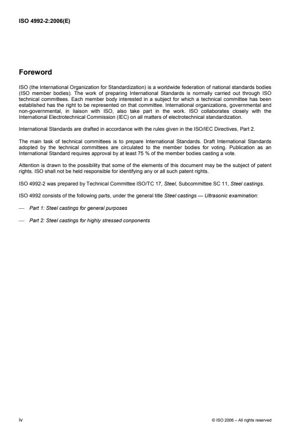 ISO 4992-2:2006 is a standard published by the International Organization for Standardization (ISO). Its full title is "Steel castings — Ultrasonic examination — Part 2: Steel castings for highly stressed components". This standard covers: ISO 4992-2:2006 specifies the requirements for the ultrasonic examination of steel castings (with ferritic structure) for highly stressed components, and the methods for determining internal discontinuities by the pulse echo technique. ISO 4992-2:2006 applies to the ultrasonic examination of steel castings which have usually received a grain-refining heat treatment and which have wall thicknesses up to and including 600 mm. For greater wall thicknesses, special agreements apply with respect to the test procedure and recording levels. ISO 4992-2:2006 does not apply to austenitic steels and joint welds.