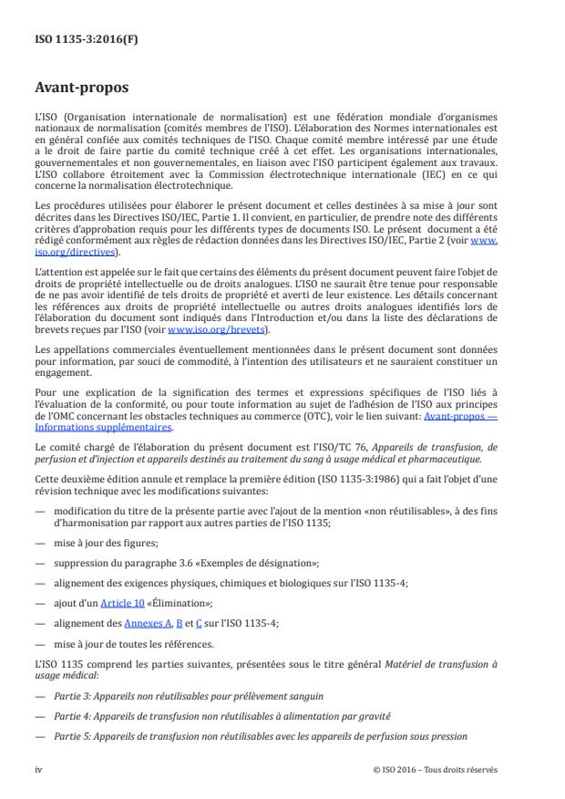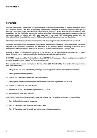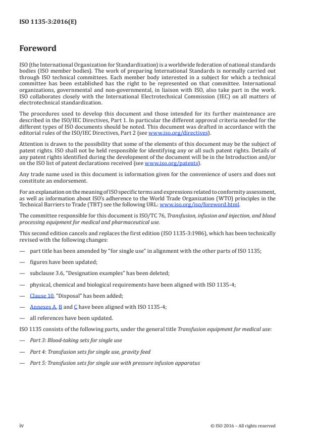 ISO 1135-3:2016 specifies requirements for types of blood-taking sets for medical use in order to ensure functional interchangeability of transfusion equipment. It is applicable to sterilized blood-taking sets intended for single use only. ISO 1135-3:2016 also aims to provide a) specifications relating to the quality and performance of materials used in transfusion equipment, and b) a unified presentation of terms for such equipment. In some countries, the national pharmacopoeia or other national regulations are legally binding and take precedence over ISO 1135-3:2016.