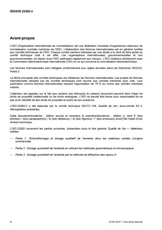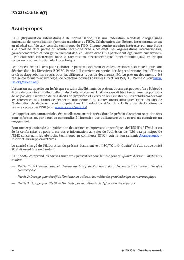 ISO 22262-3:2016 is a standard published by the International Organization for Standardization (ISO). Its full title is "Air quality - Bulk materials - Part 3: Quantitative determination of asbestos by X-ray diffraction method". This standard covers: ISO 22262-3:2016 is primarily intended for quantitative analysis of samples in which asbestos has been identified at estimated mass fractions lower than approximately 5 % by weight. ISO 22262-3:2016 extends the applicability and limit of detection of quantitative analysis by the use of simple procedures of ashing and/or acid treatment prior to XRD quantification. ISO 22262-3:2016 is applicable to the asbestos-containing materials identified in ISO 22262‑1. The following are examples of sample matrices: a) any building materials in which asbestos was detected by the analysis in ISO 22262‑1; b) resilient floor tiles, asphaltic materials, roofing felts and any other materials in which asbestos is embedded in an organic matrix and in which asbestos was detected when using ISO 22262‑1; c) wall and ceiling plasters, with or without aggregate, in which asbestos was detected when using ISO 22262‑1. If non-asbestiform serpentine or non-asbestiform amphibole minerals are included in the matrix, the XRD peaks that are assumed to be "possible peaks of asbestos" will represent these minerals. This method is not for application to natural minerals that may contain asbestos or any products that incorporate such natural minerals. This method is intended only for application to building material samples that contain deliberately added commercial grade asbestos including tremolite asbestos. ISO 22262-3:2016 is intended for use by analysts who are familiar with X-ray diffraction methods and the other analytical procedures specified in the References [5] and [6]. It is not the intention of this part of ISO 22262 to provide basic instruction in the fundamental analytical procedures.