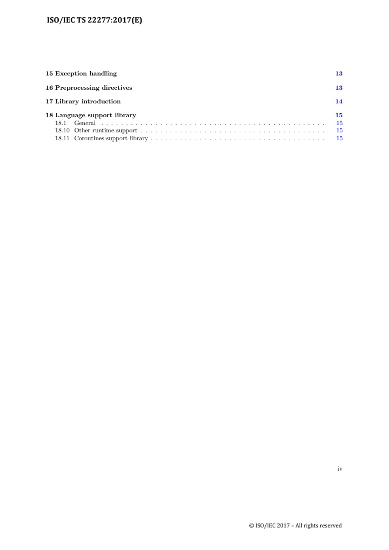 ISO/IEC TS 22277:2017 describes extensions to the C++ Programming Language (Clause 2) that enable definition of coroutines. These extensions include new syntactic forms and modifications to existing language semantics. The International Standard, ISO/IEC 14882:2014, provides important context and specification for this document. This document is written as a set of changes against that specification. Instructions to modify or add paragraphs are written as explicit instructions. Modifications made directly to existing text from the International Standard use underlining to represent added text and strikethrough to represent deleted text.
