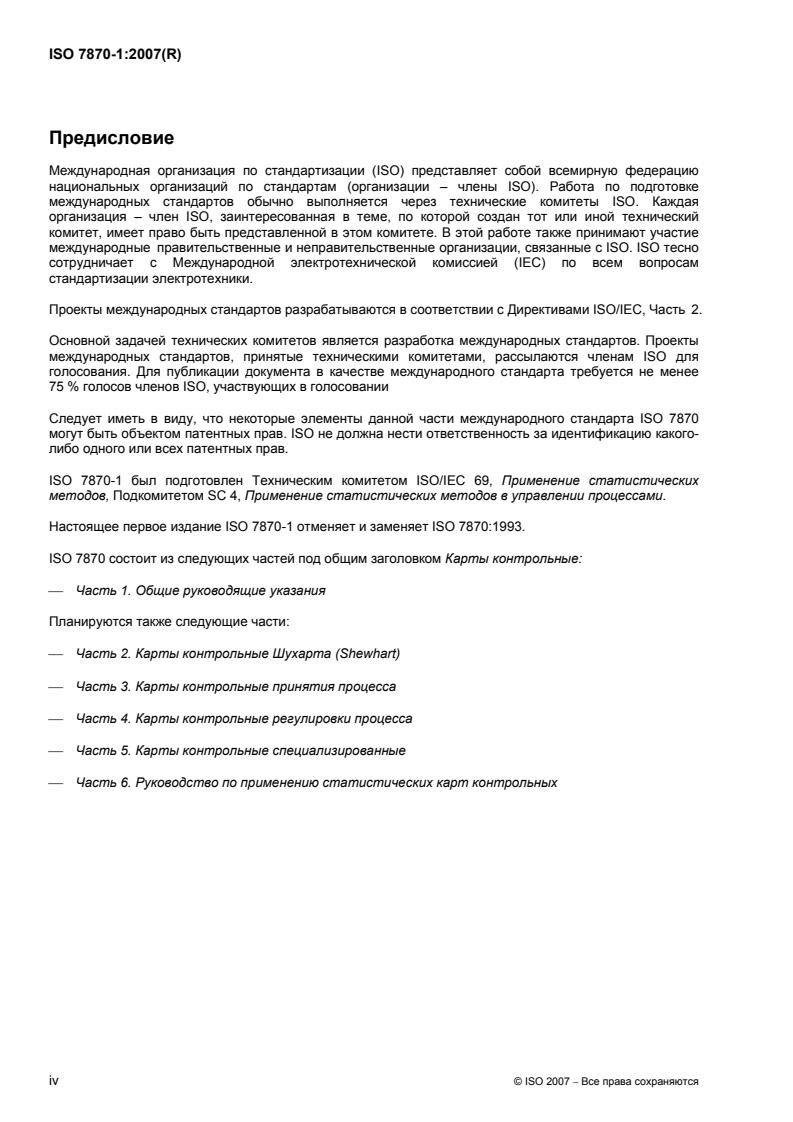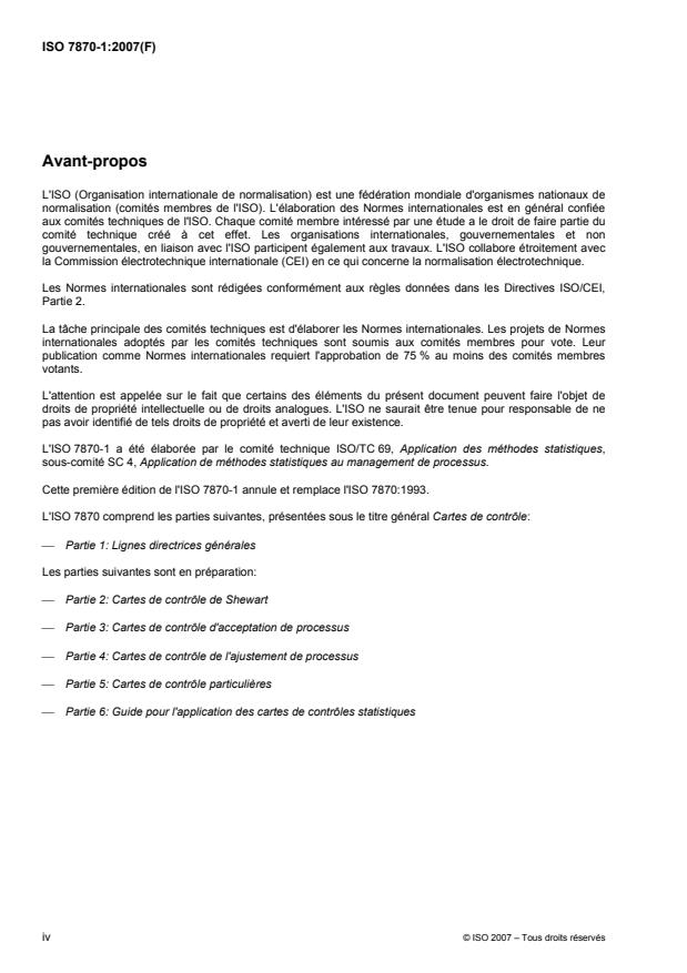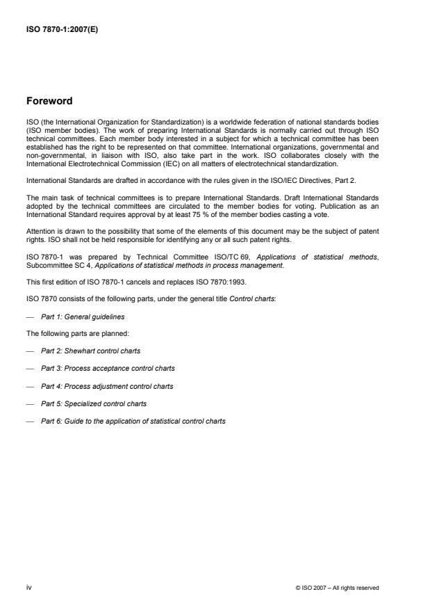 Ta del ISO 7870 predstavlja ključne elemente in filozofijo pristopa s kontrolnimi kartami in opredeljuje široko raznolikost kontrolnih kart (vključno s tistimi, ki se nanašajo na Shewhartovo kontrolno karto, in tistimi, ki poudarjajo sprejemljivost ali neposredno procesno prilagoditev). Predstavlja pregled osnovnih načel in konceptov ter ponazarja odnos med različnimi pristopi s kontrolnimi kartami za pomoč pri izbiri najbolj primernega standarda v danih okoliščinah. Ne opredeljuje metod statistične kontrole, ki uporabljajo kontrolne karte. Te metode bodo opredeljene v nadaljnjih delih ISO 7870.