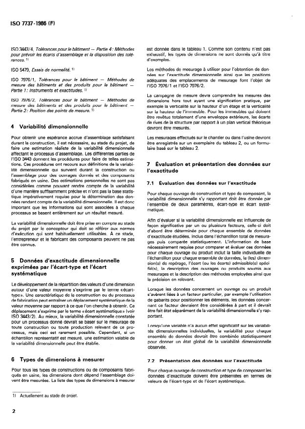 ISO 7737:1986, "Tolerances for building - Presentation of dimensional accuracy data," defines how measured dimensional accuracy data from building construction and manufactured components should be collected and presented. Intended for all types of building construction, the standard sets out the principles and formats for reporting dimensional tolerances so the data can be used directly by designers, manufacturers and contractors as reliable feedback from site and factory surveys.