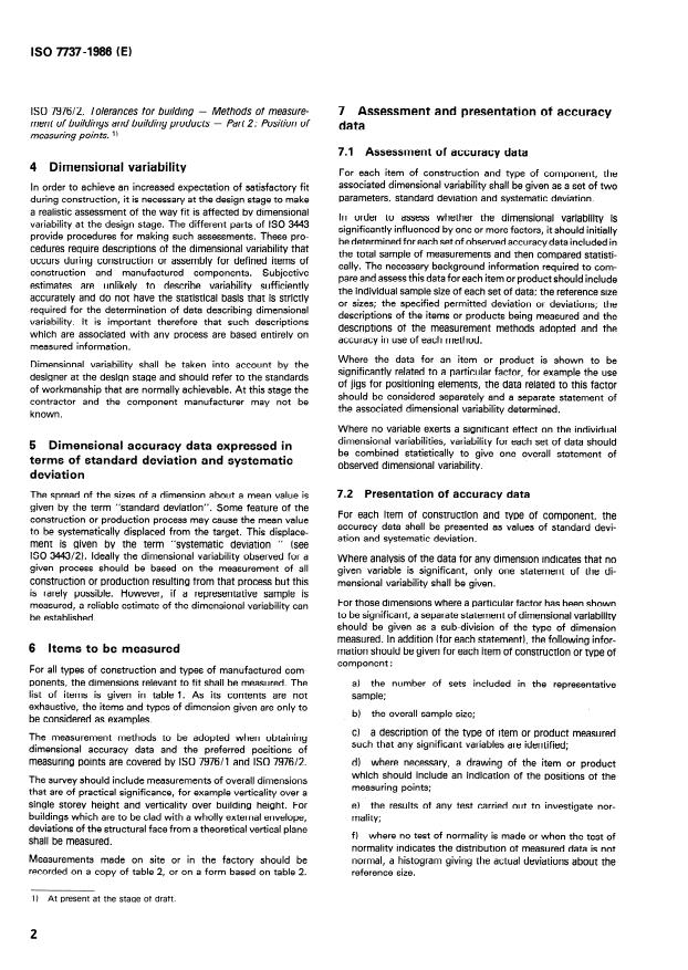 Keywords: ISO 7737, dimensional tolerances, dimensional accuracy data, building construction, standard deviation, systematic deviation, measurement format, construction surveying.