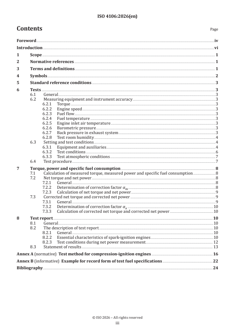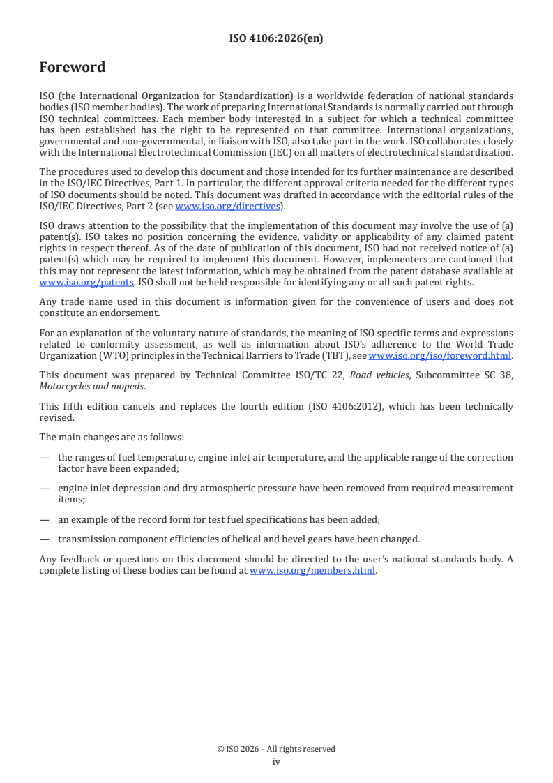 ISO 4106:2026 is a standard published by the International Organization for Standardization (ISO). Its full title is "Motorcycles — Engine test code — Net power". This standard covers: This document specifies methods for evaluating the performance of engines designed for motorcycles as defined in ISO 3833, in particular with a view to the presentation of power curves and specific fuel consumption at full load as a function of engine speed, for net power assessment. It is applicable to reciprocating internal combustion engines (spark-ignition or compression-ignition) ‒ excluding free-piston engines ‒ and rotary piston engines, either naturally aspirated or pressure-charged and equipped with either mechanical pressure-charger or turbocharger. Particular specifications for the test of compression-ignition engines are specified in Annex A.