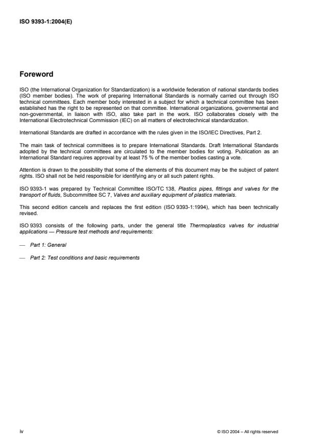 ISO 9393-1:2004 - "Thermoplastics valves for industrial applications - Pressure test methods and requirements - Part 1: General" defines the general test methods used to assess the resistance to internal pressure and leaktightness of thermoplastics valves used with cold water or industrial fluids (gas applications covered by other product standards are excluded). Part 1 sets out specimen types, conditioning, test apparatus and general procedures; Part 2 covers specific test conditions and numeric requirements.