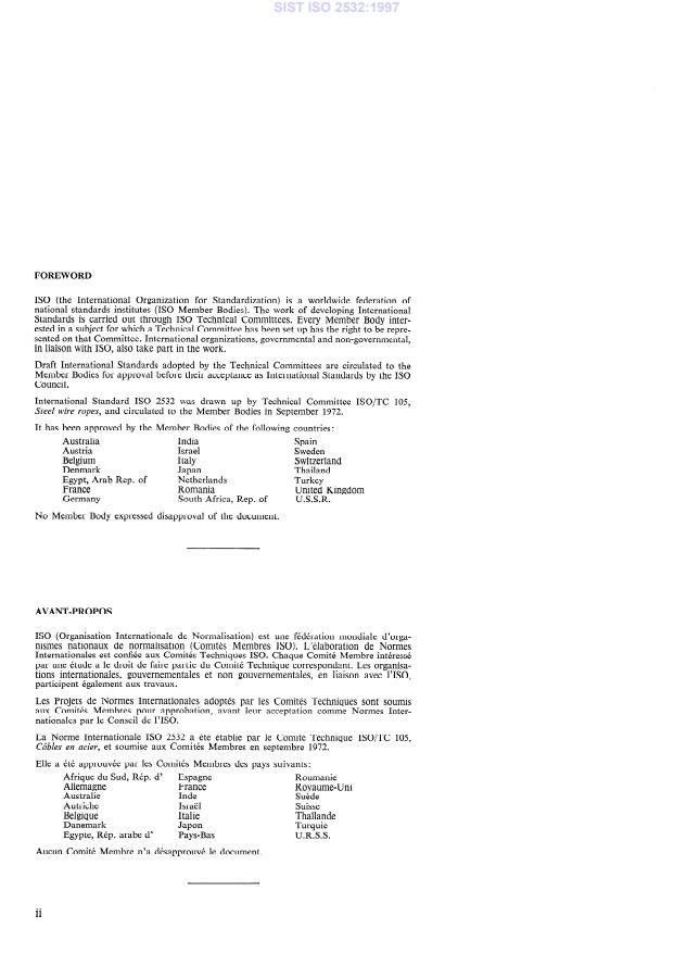 ISO 2532:1974 is a standard published by the International Organization for Standardization (ISO). Its full title is "Steel wire ropes — Vocabulary". This standard covers: Definitions are given for certain of the terms concerning steel wire ropes. The classification system used is shown by the contents list, and an alphabetical index is provided for detailed reference.