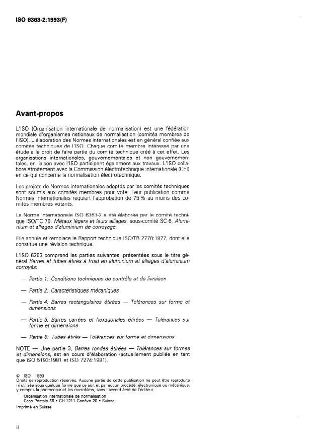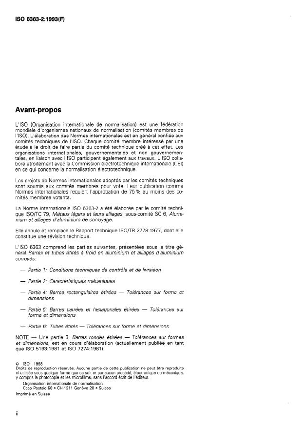 ISO 6363-2:1993 is a standard published by the International Organization for Standardization (ISO). Its full title is "Wrought aluminium and aluminium alloy cold-drawn rods/bars and tubes — Part 2: Mechanical properties". This standard covers: The following properties are specified: dimensions, tensile strength, 0,2 % proof stress, elongation. Does not apply to electrical conductors. The designations of aluminium and aluminium alloys and the temper designations are in accordance with ISO 2092, ISO 2107 and annex B respectively.