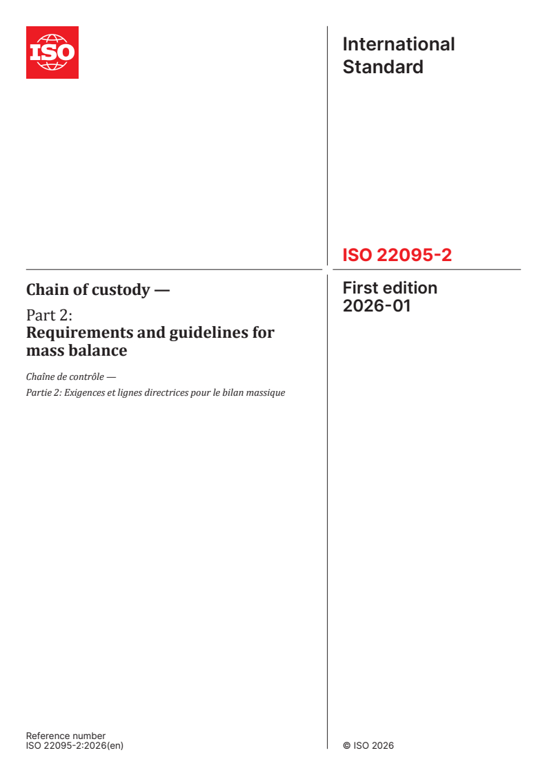 ISO 22095-2:2026 is a standard published by the International Organization for Standardization (ISO). Its full title is "Chain of custody — Part 2: Requirements and guidelines for mass balance". This standard covers: This document provides requirements and guidelines for the application of the mass balance chain of custody model, as defined in ISO 22095, to any material or product flow within mass balance systems, including how to attribute specified characteristics to flows of such processes. This document provides requirements and guidelines for the following matters, amongst others: differentiations from controlled blending and book and claim models; general requirements for organizations active in a mass balance chain of custody model; system boundaries including geography and time; conversion factors; the rolling average percentage method; the credit method; transparency, communication and claims.