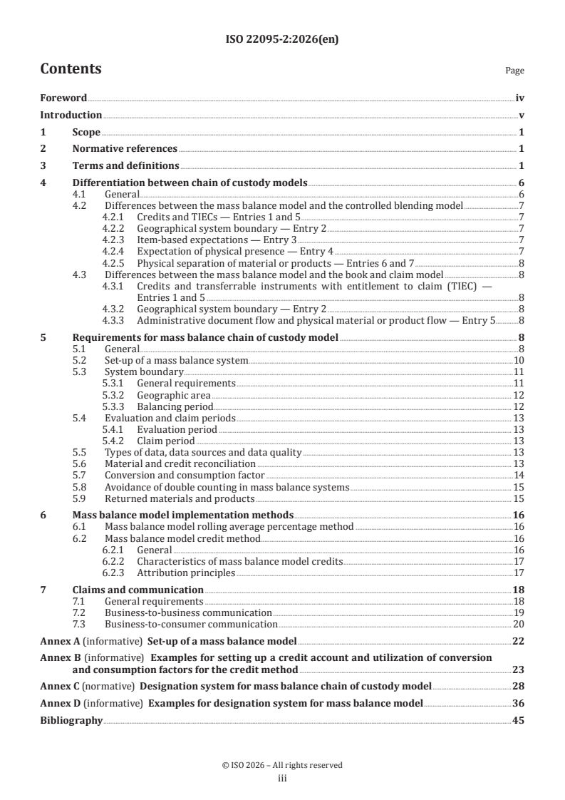 This document provides requirements and guidelines for the application of the mass balance chain of custody model, as defined in ISO 22095, to any material or product flow within mass balance systems, including how to attribute specified characteristics to flows of such processes. This document provides requirements and guidelines for the following matters, amongst others: differentiations from controlled blending and book and claim models; general requirements for organizations active in a mass balance chain of custody model; system boundaries including geography and time; conversion factors; the rolling average percentage method; the credit method; transparency, communication and claims.