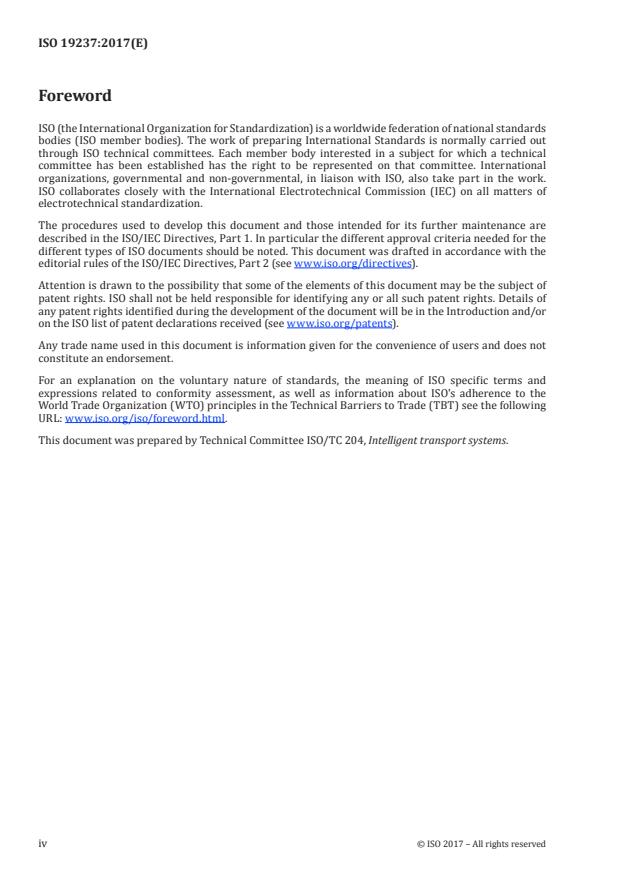 ISO 19237:2017 is a standard published by the International Organization for Standardization (ISO). Its full title is "Intelligent transport systems — Pedestrian detection and collision mitigation systems (PDCMS) — Performance requirements and test procedures". This standard covers: ISO 19237:2017 specifies the concept of operation, minimum functionality, system requirements, system interfaces, and test procedures for Pedestrian Detection and Collision Mitigation Systems (PDCMS). It specifies the behaviours that are required for PDCMS, and the system test criteria necessary to verify that a given implementation meets the requirements of this document. Implementation choices are left to system designers wherever possible. PDCMS reduce the severity of pedestrian collisions that cannot be avoided, and may reduce the likelihood of fatality and severity of injury. PDCMS require information about range to pedestrians, motion of pedestrians, motion of the subject vehicle (SV), driver commands and driver actions. PDCMS detect pedestrians ahead of time, determine if detected pedestrians represent a hazardous condition, and warn the driver if a hazard exists. PDCMS estimate if the driver has an adequate opportunity to respond to the hazard. If there is inadequate time available for the driver to respond, and if appropriate criteria are met, PDCMS determine that a collision is imminent. Based upon this assessment, PDCMS will activate CWs and vehicle brakes to mitigate collision severity. This document, while not a collision avoidance standard, does not preclude a manufacturer from implementing collision avoidance with PDCMS. Systems that include other countermeasures such as evasive steering are not within the scope of this document. Responsibility for the safe operation of the vehicle remains with the driver. ISO 19237:2017 applies to light duty passenger vehicles (see 3.6). It does not apply to other vehicle categories such as heavy vehicles or motorcycles. PDCMS are not intended for off-road use.