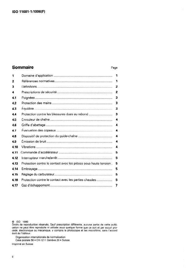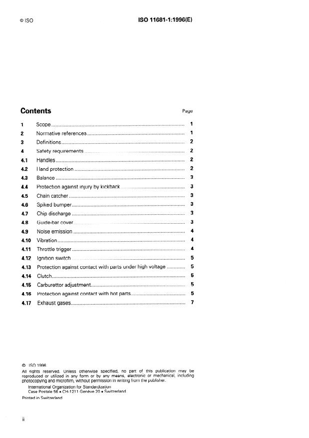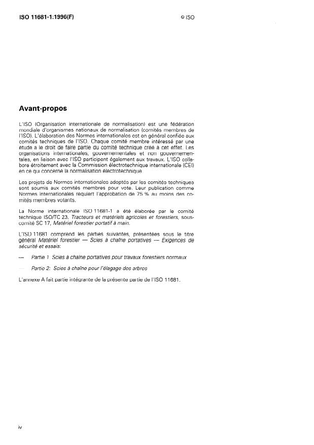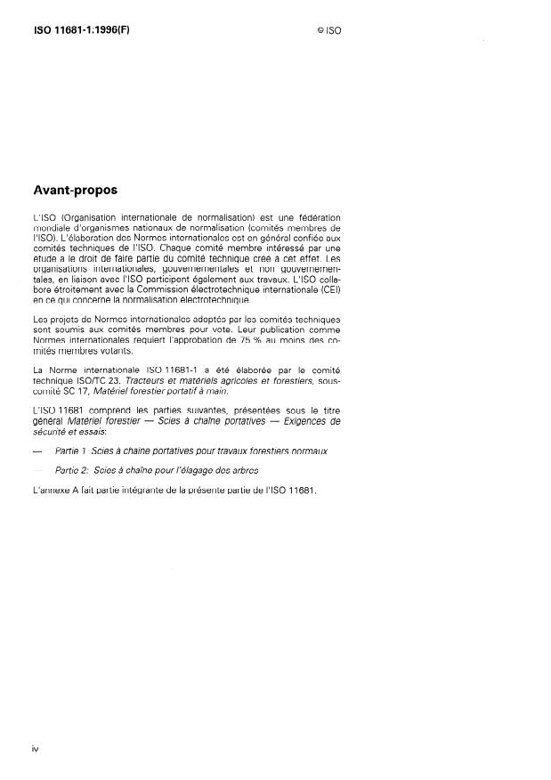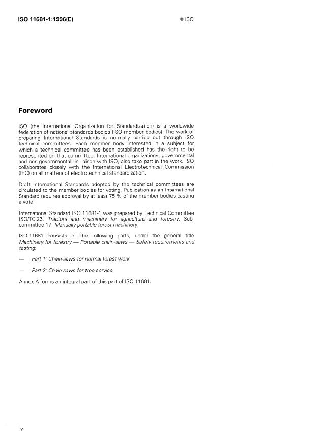 ISO 11681-1:1996 is a standard published by the International Organization for Standardization (ISO). Its full title is "Machinery for forestry — Portable chain-saws — Safety requirements and testing — Part 1: Chain-saws for normal forest work". This standard covers: Gives safety requirements of portable combustion-engines, hand-held chain-saws for normal forest work. Describes methods for elimination or reduction of hazards arising from their use.