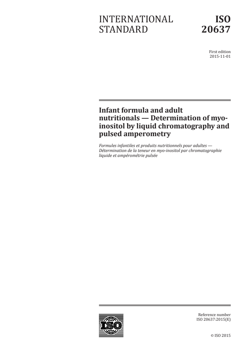 ISO 20637:2015 - Infant formula and adult nutritionals — Determination of myo-inositol by liquid chromatography and pulsed amperometry/9/2015