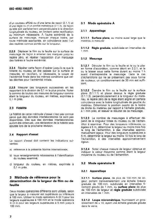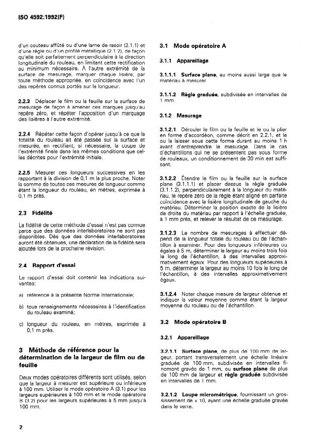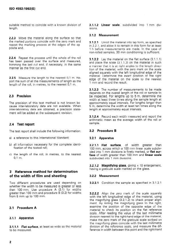 ISO 4592:1992 - "Plastics - Film and sheeting - Determination of length and width" defines reference methods for measuring the “free” length and the average “free” width of rolls and samples of plastic film and sheeting. The standard is intended as a benchmark method (for rolls up to 100 m) to which other measuring methods or automated systems can be calibrated. It also specifies a reference procedure for measuring sample widths down to 5 mm (with limited accuracy near that minimum).