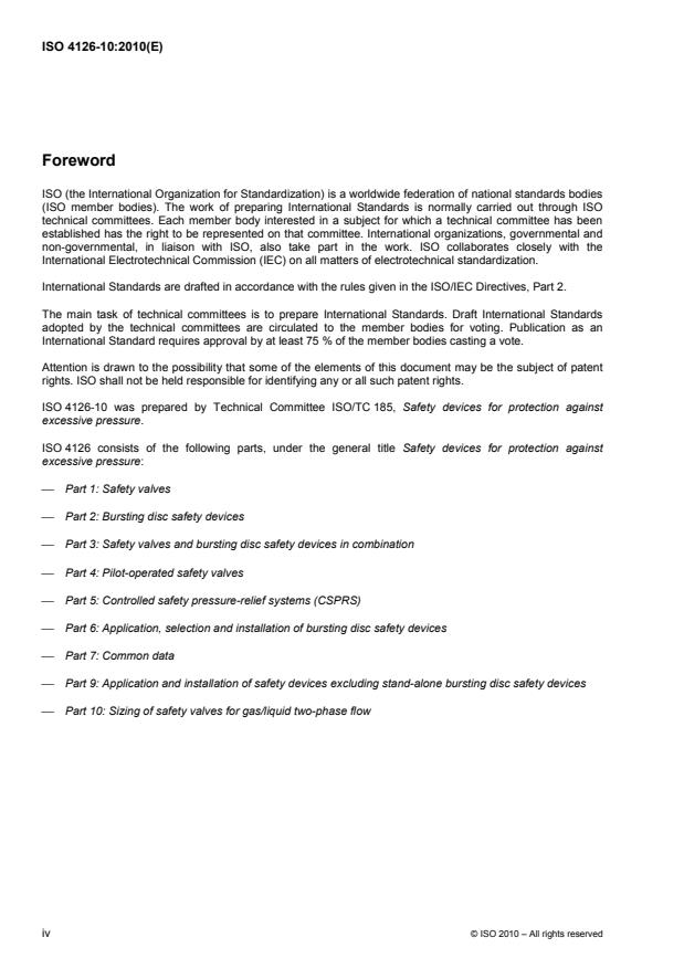 ISO 4126-10:2010 specifies the sizing of safety valves for gas/liquid two-phase flow in pressurized systems such as: reactors, storage tanks, columns, heat exchangers, piping systems or transportation tanks/containers.