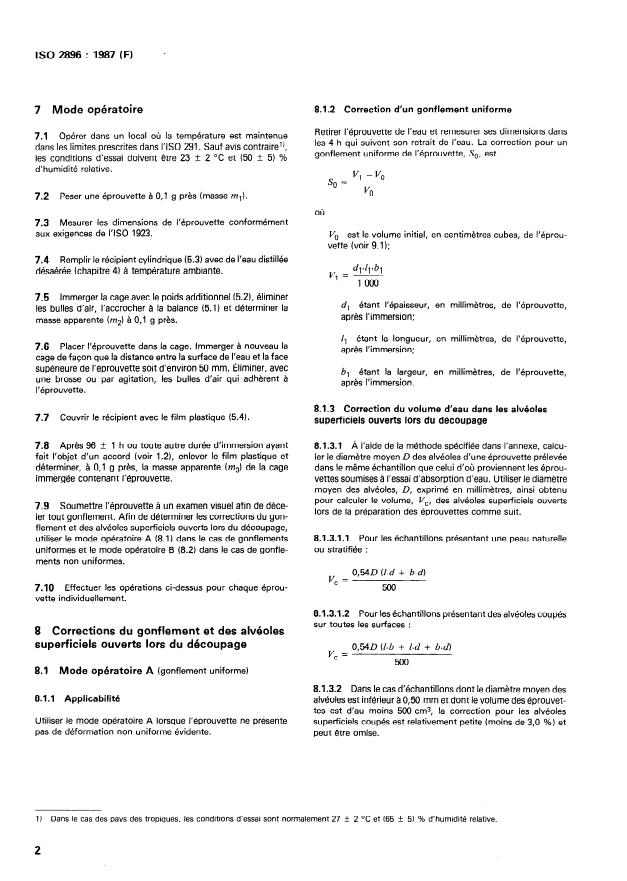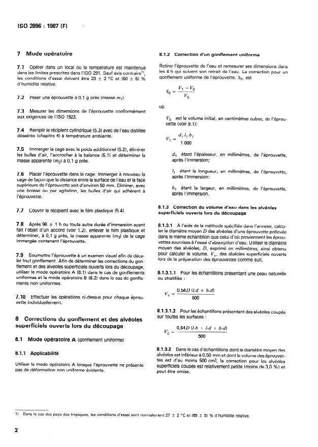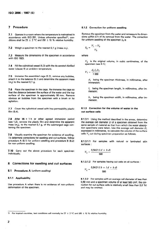 ISO 2896:1987 is a standard published by the International Organization for Standardization (ISO). Its full title is "Cellular plastics, rigid — Determination of water absorption". This standard covers: Specifies a method for the determination of the water absorption of rigid cellular plastics by measuring the change in the buoyant force resulting from immersion of a specimen in water for 4 days. Corrections are specified to take account of any change in volume of the specimen and also tocorrect for the volume of water in the cut surface cells of the specimen. Water absorption is expessed as an average percentage increase over the orginal volume of the specimen.