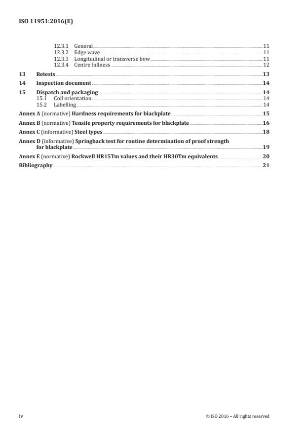 Keywords: ISO 11951:2016, blackplate, cold‑reduced, tinmill products, electrolytic tinplate, ECCS, coil specifications, thickness tolerances, hardness test, tensile test, flatness.