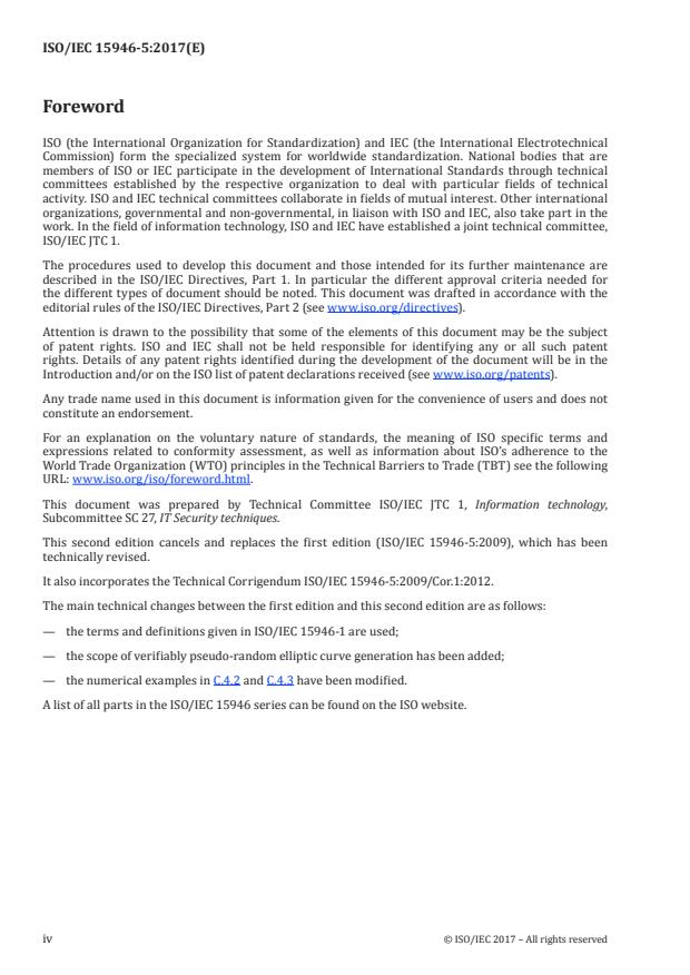 The ISO/IEC 15946 series specifies public-key cryptographic techniques based on elliptic curves described in ISO/IEC 15946‑1. ISO/IEC 15946-5:2017 defines elliptic curve generation techniques useful for implementing the elliptic curve based mechanisms defined in ISO/IEC 29192‑4, ISO/IEC 9796‑3, ISO/IEC 11770‑3, ISO/IEC 14888‑3 and ISO/IEC 18033‑2. ISO/IEC 15946-5:2017 is applicable to cryptographic techniques based on elliptic curves defined over finite fields of prime power order (including the special cases of prime order and characteristic two). This document is not applicable to the representation of elements of the underlying finite field (i.e. which basis is used). The ISO/IEC 15946 series does not specify the implementation of the techniques it defines. Interoperability of products complying with the ISO/IEC 15946 series will not be guaranteed.