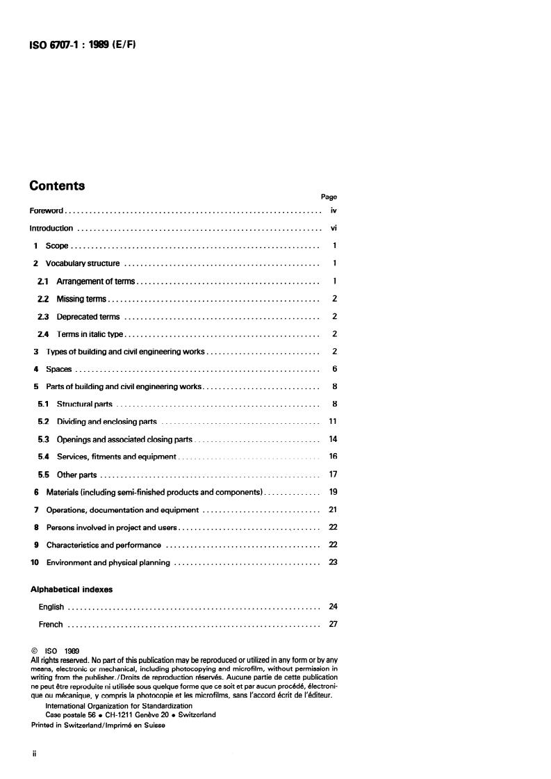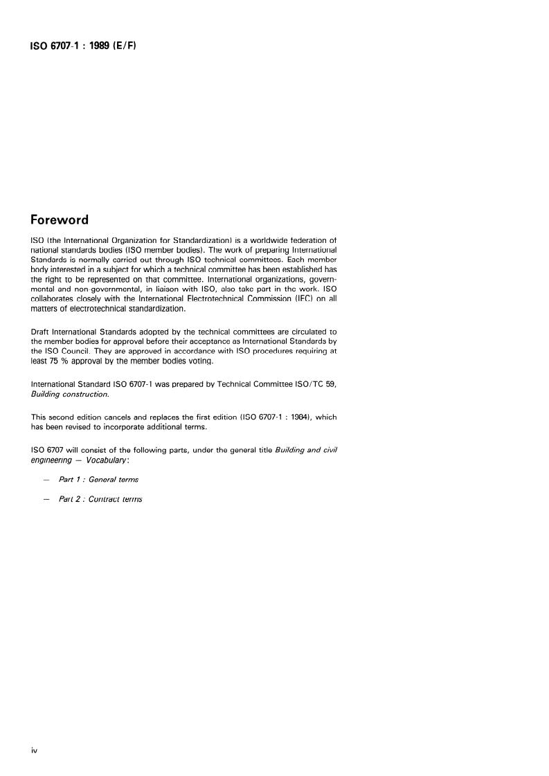 ISO 6707-1:1989 is a standard published by the International Organization for Standardization (ISO). Its full title is "Building and civil engineering — Vocabulary — Part 1: General terms". This standard covers: Defines general terms, in English and French, applicable to building and civil engineering works. Comprises a) fundamental concepts which may be the starting point for other, more specific, definitions; b) more specific concepts used in several areas in building and that may be used commonly in standards, regulations and contracts.