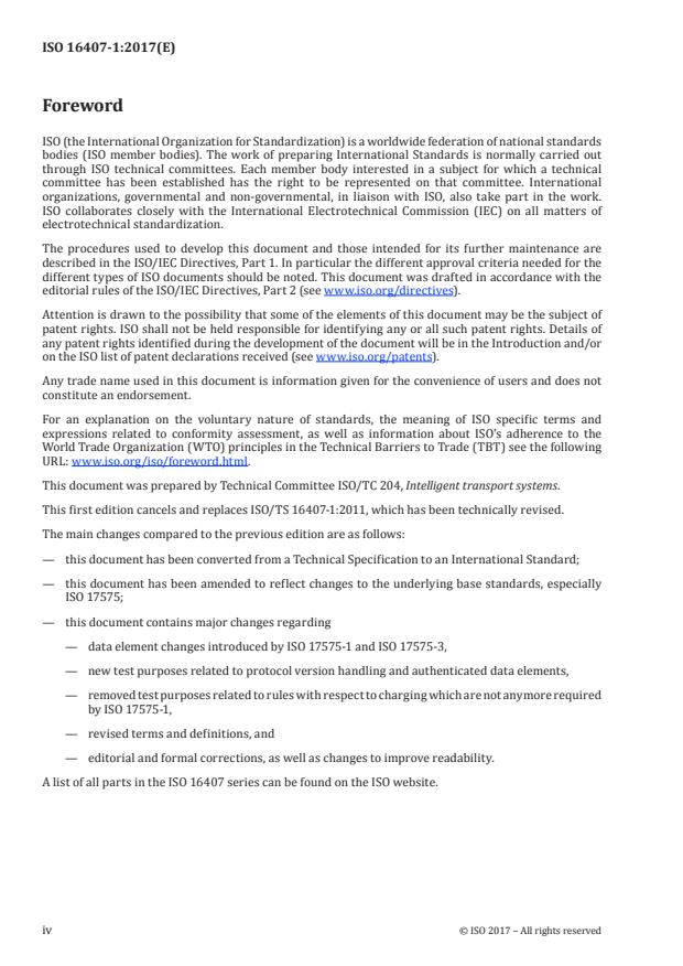 The ISO 16407 series of standards specifies a suite of tests in order to assess the Front End and Back End behaviour compliancy towards the requirements listed in ISO 17575-1. ISO 16407-1:2017 contains the definition of such tests in the form of test purposes, listing the required initial conditions, references and individual steps in a structured textual manner.