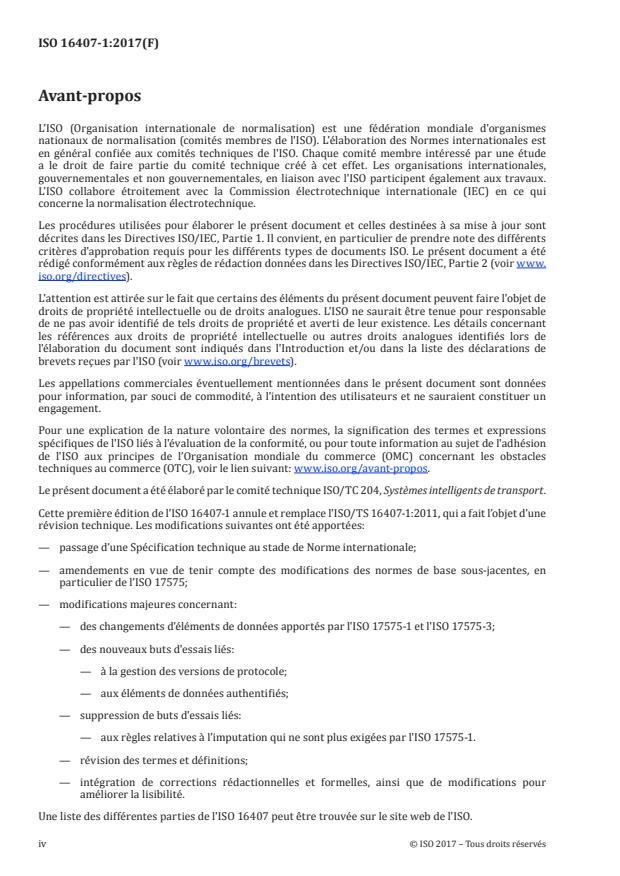 Les normes ISO 16407 ont pour domaine d'application la fourniture d'une série d'essais ayant pour but d'évaluer la conformité des comportements du système frontal et du système central par rapport aux exigences énumérées dans l'ISO 17575-1. L'ISO 16407-1 :2017 contient la définition de tels essais sous forme de buts d'essais, donnant la liste des conditions initiales requises, des références et des étapes individuelles, d'une manière textuelle structurée.
