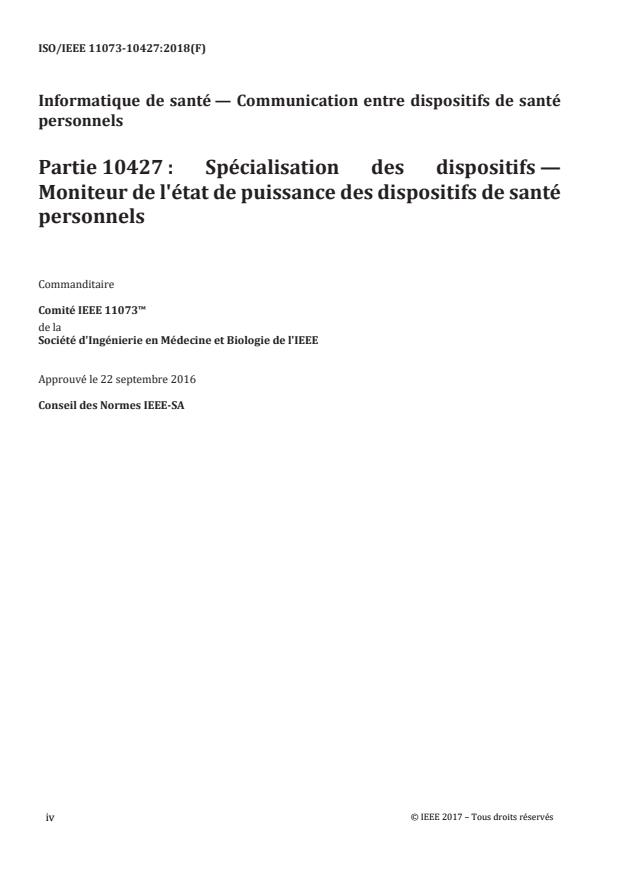 ISO/IEEE 11073-10427:2018 is a standard published by the International Organization for Standardization (ISO). Its full title is "Health informatics — Personal health device communication — Part 10427: Device specialization — Power status monitor of personal health devices". This standard covers: ISO/IEEE 11073-10427:2018 establishes a normative defi nition of communication between devices containing a power source (agents) and managers (e.g., cell phones, personal computers, personal health appliances, set-top boxes) in a manner that enables plug-and-play interoperability. Using existing terminology, information profi les, applica-tion profi le standards, and transport standards as defi ned in other ISO/IEEE 11073 standards, this standard de-fi nes a common core of communication functionality of personal health devices (PHDs) containing a battery, including: 1) current device power status (e.g., on mains or on battery); 2) power charge status (e.g., percent of full charge); and 3) estimated time remaining (e.g., minutes).
